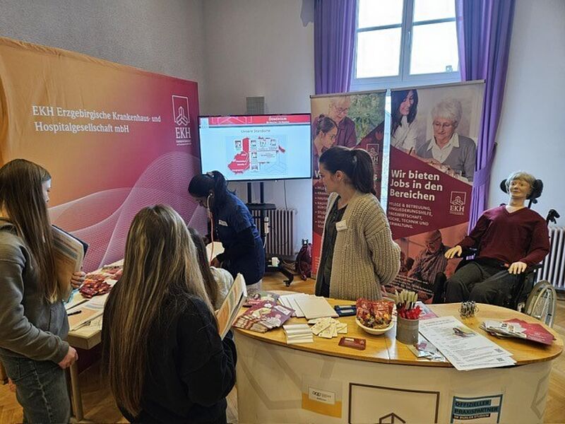 Am Mittwoch, 28.01.2026 fand der „Markt der Möglichkeiten“ für die Schülerinnen und Schüler der Jenaplanschule Markersbach im Kaiserhof statt. Herr Schaarschmidt (HL Haus Fichtelbergblick), Frau Scheffler (Personalwesen) und Frau Meenakshy Manohar (Auszubil-dende) waren vor Ort, um die EKH mbH zu vertreten.