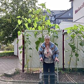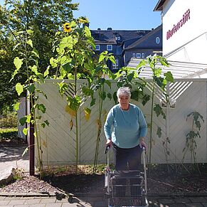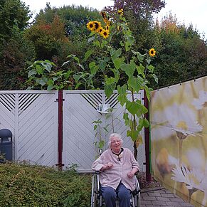 Die am 17. April übergebenen Sonnenblumen-Samen wurden von unseren Bewohner/innen fürsorglich gehegt und gepflegt. Und wie soll es anders sein, kleine Schritte am Anfang können am Ende Großes bewirken. Und so sind die Sonnenblumen bis zum Herbst stattlich gewachsen und in voller Farbenpracht, sonnengelb erblüht.