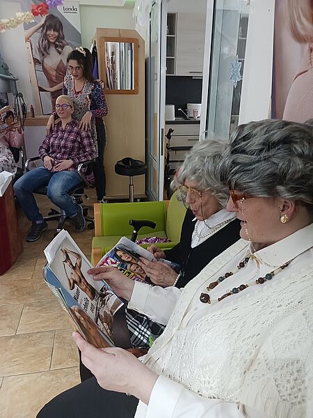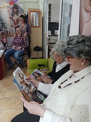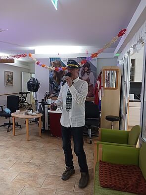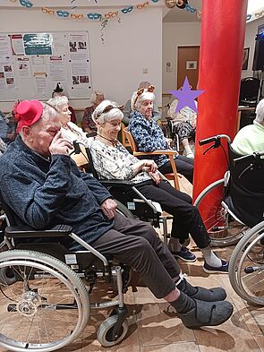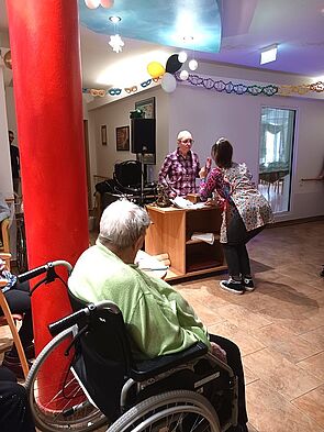 Nach einem deftigen Brunch im Wohnbereich nahmen unsere Bewohner im "Friseursalon Karin" Platz, wo sich die namensgebende Chefin mit ihrem Lehrling Chantal um eine sehr bunte Kundschaft mit unterschiedlichsten Ansprüchen kümmerte. Da waren Herausforderungen und Probleme vorprogrammiert! Herr Bittner von der Käferdisco unterstützte das Betreuungsteam in musikalischer Hinsicht, sodass einem heiteren, kurzweiligen Faschingsvormittag nichts im Wege stand!